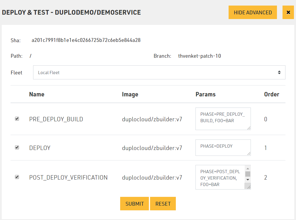 Each CI/CD run comprises of one or more phases. There are two types of phases – execution and deployment. In execution phase Katkit will invoke ci.sh file from the repository. The difference between two execution phases is in ENV variables based on which user code in ci.sh can operate differently. There can be only one deployment phase in each run. Katkit does not run ci.sh in deployment phase but it looks for the servicdescription.js file (details below), replaces the docker image tag <hubtag> and replaces it with the git commit sha. It is assumed that the user, before invoking the deployment phase, has gone through a prior phase where they build a docker image which was tagged with the git commit sha. The sha is available as an ENV variable in every phase.