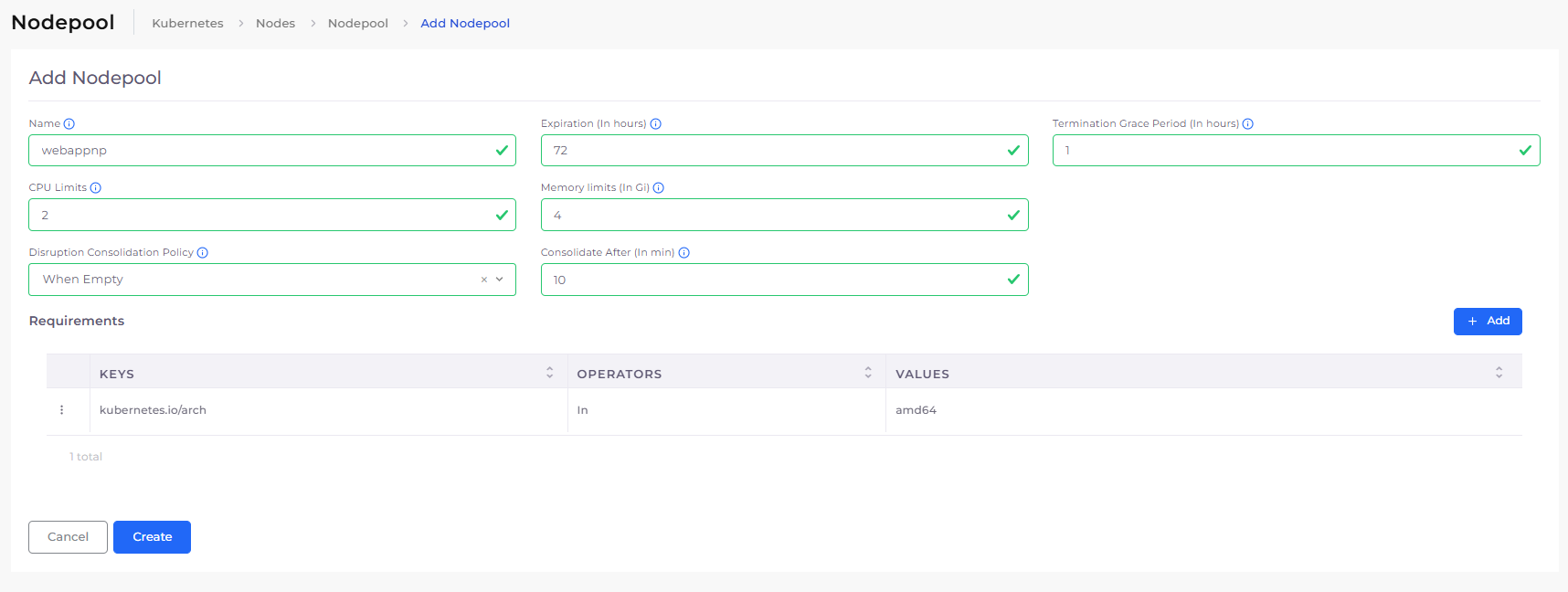 <table data-header-hidden><thead><tr><th width="213.99993896484375"></th><th></th></tr></thead><tbody><tr><td><strong>Name</strong></td><td>Enter a name for the node pool. </td></tr><tr><td><strong>Expiration (In hours)</strong></td><td>Enter the number of hours after which the nodes in this pool should automatically expire and be deleted.</td></tr><tr><td><strong>Termination Grace Period (In hours)</strong></td><td>Enter the time allowed for the node to drain its pods before they are forcefully deleted and the node is removed. If you're using <strong>EKS Auto Mode</strong> and leave this field blank, it defaults to <strong>24 hours</strong>.</td></tr><tr><td><strong>CPU Limits</strong></td><td>Enter the total number of vCPUs to allocate to this node pool. This helps control scaling behavior.</td></tr><tr><td><strong>Memory Limits (In Gi)</strong></td><td>Enter the total memory (in GiB) to allocate to this node pool.</td></tr><tr><td><strong>Disruption Consolidation Policy</strong></td><td><p>Select to determine how EKS handles potential disruptions to running workloads when performing node consolidation:</p><ul><li><strong>When Empty</strong>: Nodes are only considered for disruption (removal or replacement) if they have no running pods.</li><li><strong>When Empty or Underutilized</strong>: Nodes are considered for disruption if they are empty or have been underutilized for the duration specified in the <strong>Consolidate After</strong> field</li></ul></td></tr><tr><td><strong>Consolidate After (In min)</strong></td><td>Enter the number of minutes to wait before consolidating nodes after a disruption is detected.</td></tr><tr><td><strong>Requirements</strong></td><td>Click the <strong>Add</strong> button and use <strong>Key</strong>, <strong>Operator</strong>, and <strong>Value</strong> to define node selection rules for workload placement. This allows you to target specific instance types, zones, or other node attributes.</td></tr></tbody></table>