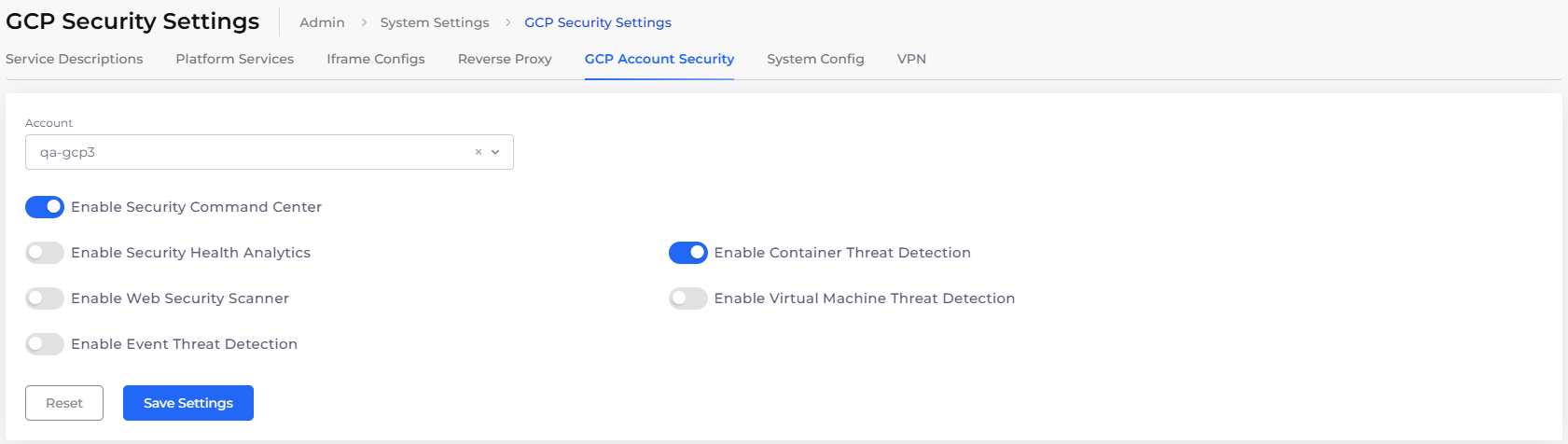<figure><img src="https://2471407984-files.gitbook.io/~/files/v0/b/gitbook-x-prod.appspot.com/o/spaces%2F68cb0s9ce5UIUKWPuYs8%2Fuploads%2F1u5Mjk3Qqoc7IYsdZKAH%2FScreenshot%20(300).png?alt=media&#x26;token=80b1f736-419a-439f-bc1f-34149d10302a" alt=""><figcaption><p><strong>GCP Security Settings</strong> page with <strong>Enable Security Command Center</strong> and <strong>Enable Container Threat Detection</strong> settings enabled</p></figcaption></figure>