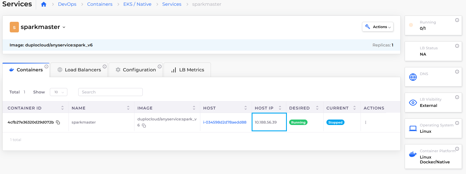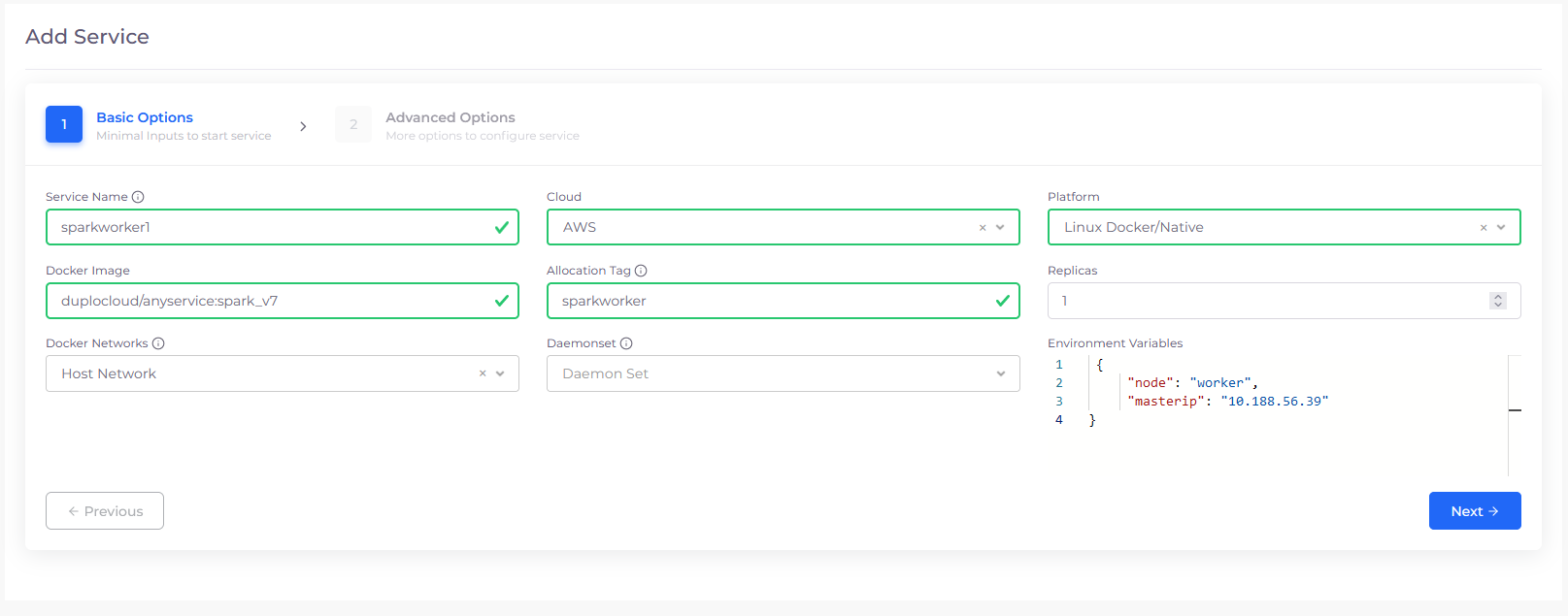 Create another service named ‘sparkworker1`, image ‘duplocloud/anyservice:spark_v7‘, add the allocation tag ‘sparkworker‘ and select Host Network for Docker Network. Also provide the environment variables
