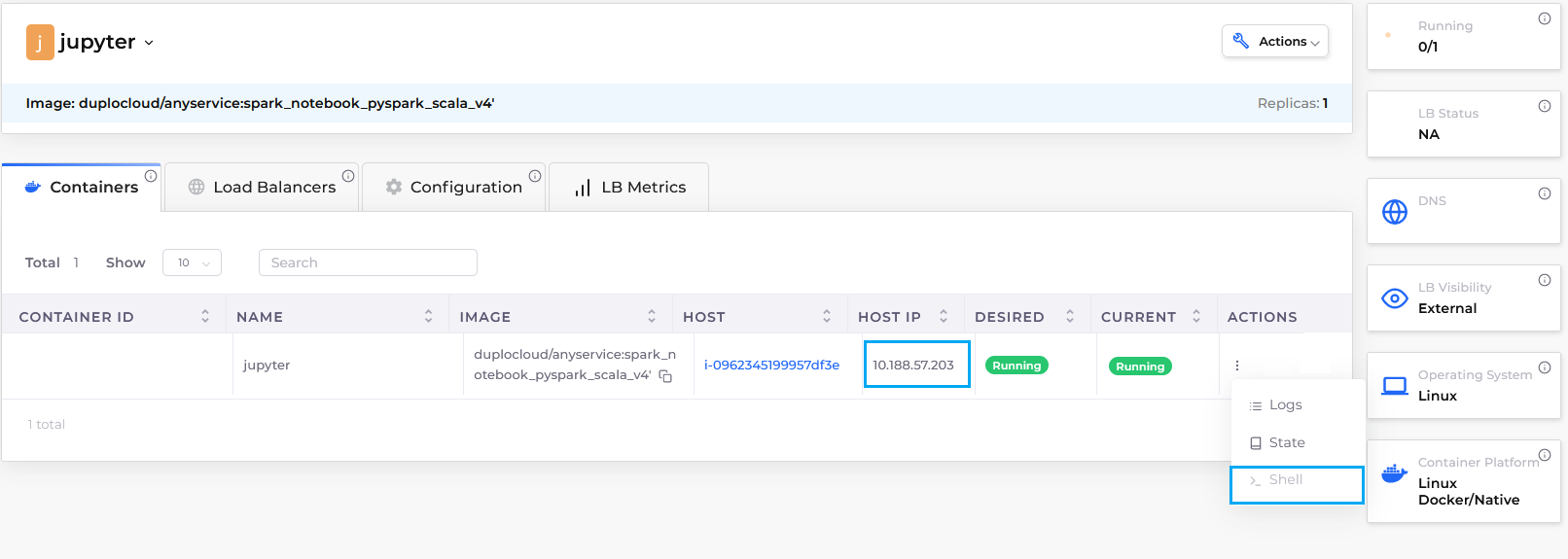 Select Jupyter service and expand the container. Copy the Host IP and then click on >_ icon.