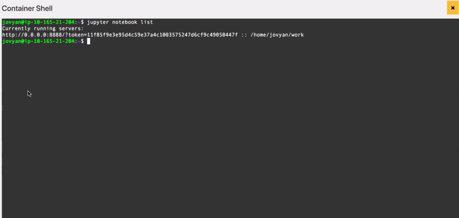 Once you are inside the shell. Run command ‘> jupyter notebook list‘ to get the URL along with auth token. Replace the IP with Jupyter IP you copied previously. See Figure 5.