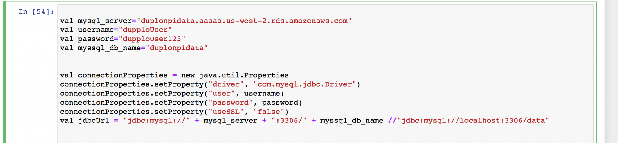 First we need the IP address of Spark master. Click on Spark master service and on the right expand the container details and copy the host IP. Create another service, under name choose ‘jupyter‘, image ‘duplocloud/anyservice:spark_notebook_pyspark_scala_v4‘, add the allocation jupyter and select Host network for Docker Host Config, Add volume mapping “/home/ubuntu/jupyter:/home/jovyan/work“, Also provide the environment variables