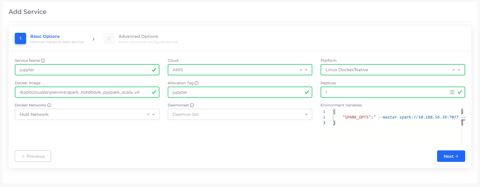 Navigate to Docker -> Services and click Add. In the Service Name field, enter ‘sparkmaster‘ and in the Docker Image field, enter ‘duplocloud/anyservice:spark_v6', add the allocation tag ‘sparkmaster‘. From the Docker Networks list box, select Host Network. By setting this in Docker Host config you are making the container networking the same as the VM i.e., container IP is same as VM.