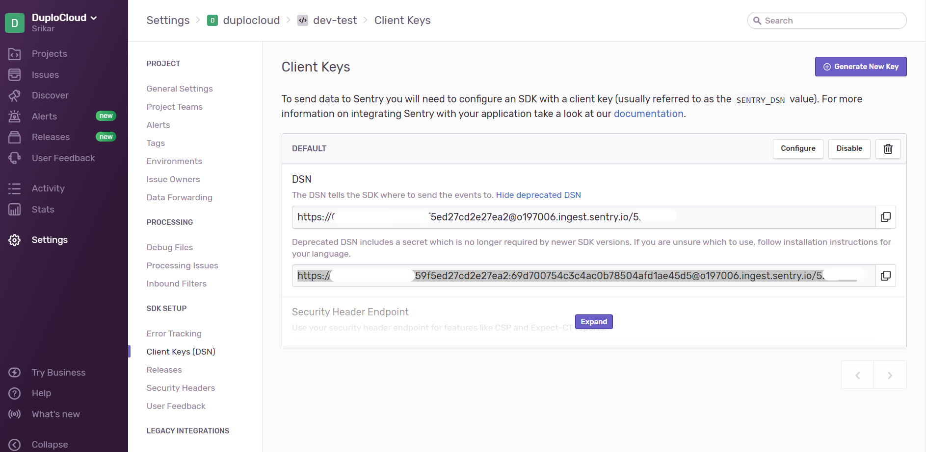Client Keys page on Sentry website with DSN fields In the DuploCloud Portal, navigate to Observability -> Faults.