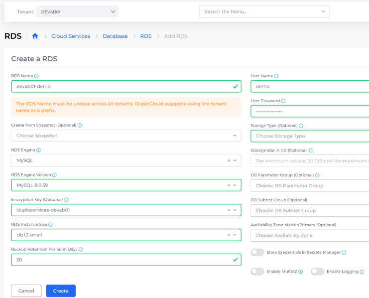 * **Name**: \[*add* `-demo` *to the name DuploCloud pre-populates*]&#x20;